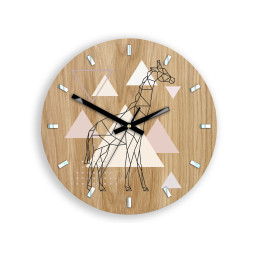 Ceasurile de perete sunt fabricate din placaj de stejar de 3 mm, pe o bază de MDF. Pe cadranul ceasului se află un motiv viu și colorat cu o girafă geometrică pe fundalul figurilor, ceea ce le conferă un caracter foarte elegant și modern.