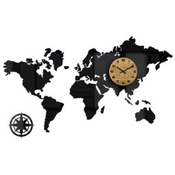 Ceasuri de perete mari și elegante - o expoziție compusă dintr-o hartă a lumii și un cadran din stejar care arată timpul. Designul și stilul său modern vor captiva pe oricine se uită la el. Continentele sunt fabricate din sticlă acrilică lucioasă NEAGRĂ. Ceasurile se integrează frumos în interioarele cu accesorii din lemn.