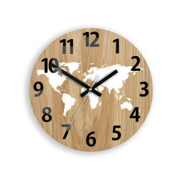 Ceas de perete din stejar masiv cu un design clasic, dar modern, având un frumos imprimeu al hărții lumii. Cifernicul din lemn simplu este decorat cu cifre arabe negre care indică orele, armonizându-se interesant cu stilul și detaliile întregului proiect.