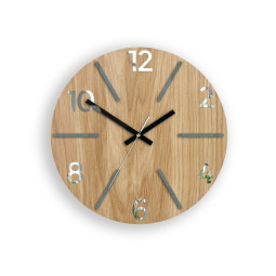Ceasuri din lemn cu un cadran din stejar, cu cifre argintii reflectorizante și indecși albaștri. Simplitatea și frumusețea sa vor impresiona pe oricine se uită la el. O decorațiune originală pentru living, birou și este o idee frumoasă pentru un cadou. Ceasurile sunt ambalate într-o cutie elegantă.