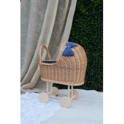 Un cărucior din rattan frumos și unic pentru păpuși.