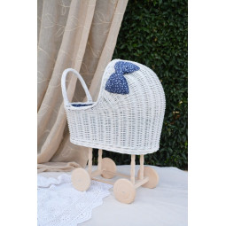 Un cărucior din răchită, frumos și unic pentru păpuși.