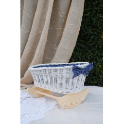 Pătuț din nuiele pentru păpuși, cu așternut albastru