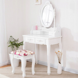 Frumos birou de toaleta pentru fiecare doamnă care apreciază confortul și eleganța în propria casă. Include un birou cosmetic cu oglindă rabatabilă și un scaun confortabil. Fabricat în stil vintage cu modele de trandafiri, colțuri rotunjite și decorațiuni. Cele patru sertare cu siguranță vor putea stoca bijuterii și produse cosmetice. Biroul de toaleta are o oglindă centrală ovală mobilă.