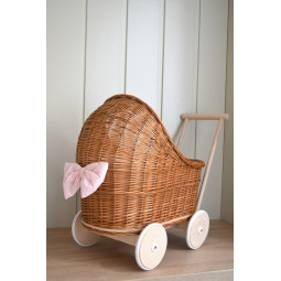 Un cărucior pentru păpuși frumos și unic. Visul împlinit al fiecărei tinere domnișoare. O jucărie frumoasă și practică. Mânerul din lemn, plasat mai jos decât la un cărucior obișnuit, și construcția stabilă permit copiilor mai mici să se joace în siguranță. În crearea fiecărui produs, punem accent pe precizie și estetică, astfel încât fiecare client să fie mulțumit de efectul final. Căruciorul din nuiele va fi cu siguranță un element unic în camera copiilor.