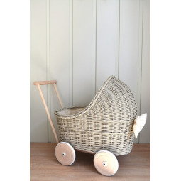 Un cărucior pentru păpuși frumos și unic. Un vis împlinit pentru fiecare tânără domnișoară. O jucărie frumoasă și practică. Mâner din lemn, amplasat mai jos decât la un cărucior obișnuit, și o construcție stabilă vor permite copiilor mai mici să se joace în siguranță. Atunci când creăm fiecare piesă, punem accent pe precizie și estetică, pentru ca fiecare client să fie mulțumit de efectul final. Căruciorul din răchită va fi cu siguranță un element unic în camera copilului.