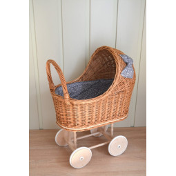 O căruță frumoasă și unică pentru păpuși. Visul împlinit al fiecărei tinere domnișoare. O jucărie frumoasă și practică. Mâner din lemn, amplasat mai jos decât la o căruță obișnuită, iar construcția stabilă va permite copiilor mai mici să se joace în siguranță. În timpul creării fiecărui exemplar, punem accent pe precizie și estetică, pentru ca fiecare client să fie mulțumit de efectul final. Căruța din nuiele va fi cu siguranță un element unic în camera copiilor.