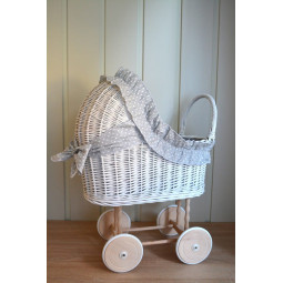 Un cărucior pentru păpuși frumos și robust din răchită, cu un fundiță originală și volan. Visul împlinit al fiecărei tinere domnișoare.