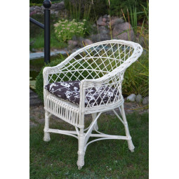 Scaun de grădină alb cu pernuță maro cu flori crem.
