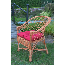 Scaun din răchită naturală pentru grădină, cu perna roșie.
