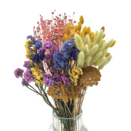 O combinație unică de flori uscate, atent selectate, în culori vesele și proaspete. Zile de naștere, inaugurări, nunți – fiecare ocazie este ideală pentru a oferi un buchet uscat, mai ales când poate rămâne mai mult timp cu persoana sărbătorită și să amintească de amintiri frumoase. Un buchet din plante uscate este bogat și expresiv. Se potrivește atât ca dar, cât și ca un accesoriu stilat pentru interiorul unui apartament, hotel sau restaurant. Și ce este cel mai bun – nu trebuie să schimbi apa din vază.