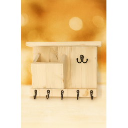 Această suport pentru chei din lemn este o soluție practică și estetică pentru menținerea ordinii în vestibul, hol sau birou. Datorită combinației de raft și cârlige metalice, oferă suficient spațiu pentru depozitarea cheilor, accesoriilor mici sau corespondenței.